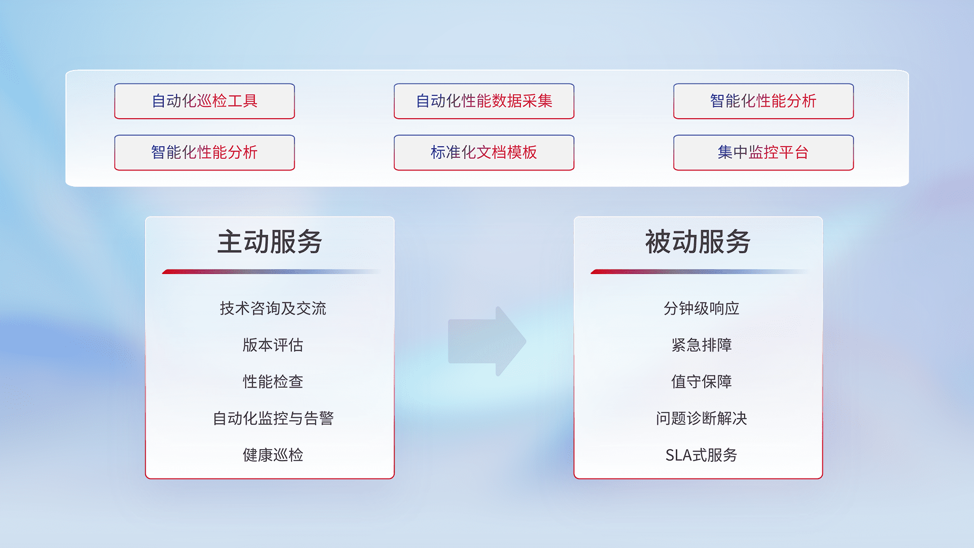 智能化工具和标准化文档,,保障服务质量,,提供主动服务(包含技术咨询、、版本评估、、、性能检查、、、、自动化监控与告警、、、健康巡检)和被动服务包含(分钟级响应、、、、紧急排障、、、、值守保障、、问题诊断解决、、SLA服务)。。
