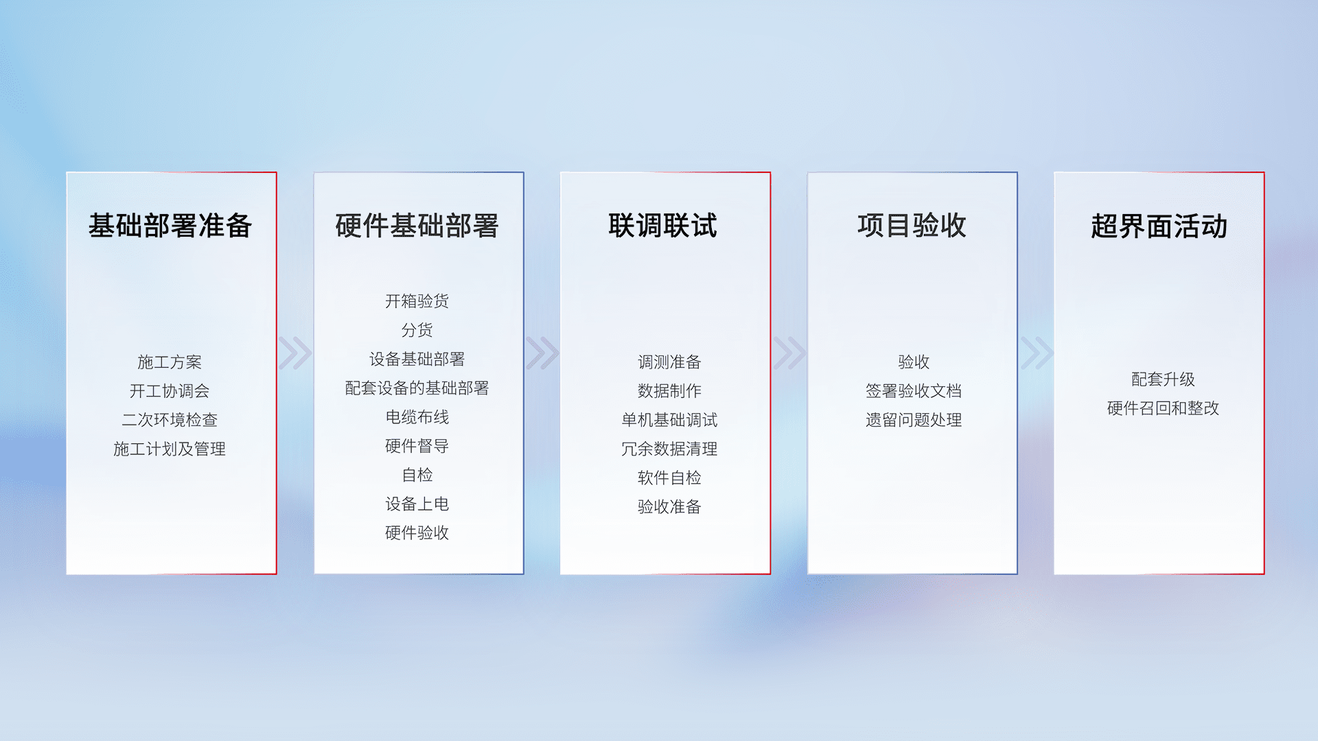 从基础部署准备、、、、硬件基础部署、、、联调联试、、项目验收、、越界面活动的全过程可追溯,,,,保证施工质量和进度。。。